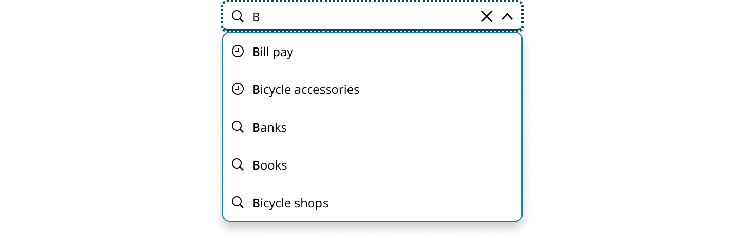 - Result item: An individual entry within the search results dropdown. It can include various elements such as secondary labels, icons, or avatars.